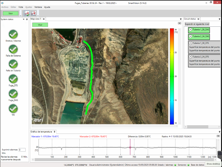Tras la puesta en marcha, se recopiló información de campo y se entrenó el sistema mediante pruebas controladas —excavaciones y aplicación de calor sobre la fibra—. Esto permitió establecer parámetros normales de operación y configurar alertas automáticas: cada vez que se detectan valores anómalos, el sistema emite una alarma inmediata, asegurando una respuesta rápida y precisa.